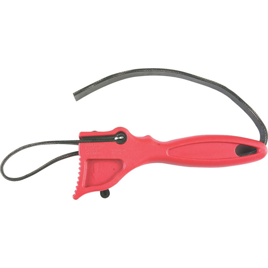 Csövekhez és alaktalan tárgyakhoz könnyen állítható erős gumiszíj, műanyag fogantyúban.