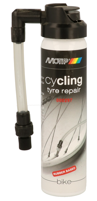 Azonnali javítási segítség minden típusú gumiabroncshoz. Gáz alapú és bezárja a lyukat. Ez lehetővé teszi, hogy a legközelebbi benzinkútnál a kerék és a gumiabroncs cseréje ott történjen. Kerékpárok, motorkerékpárok és robogók számára alkalmas.