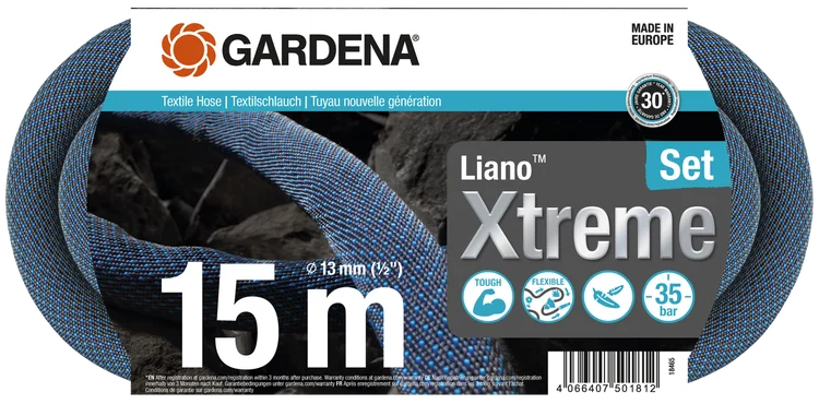 Gardena Liano™ Xtreme textil tömlő készlet, 13 mm (1/2"), 35 bar, 15 m/tekercs